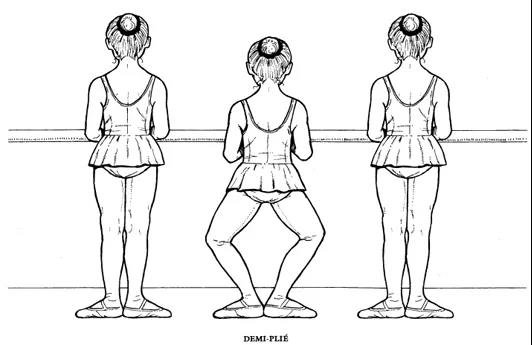 得米普力也, Demi plié, 半蹲。這是芭蕾的一個基本動作,膝蓋往腳尖的方向盡可能的彎曲,直到腳跟夠不到地為止。腳掌要在地板上,一個好的Demi plié應(yīng)該是一種有彈性的,讓人能感覺伸縮自如的一個動作。如果半蹲都練不好,那就不可能成為一個好的芭蕾舞者。