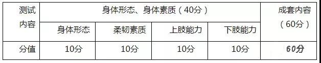 評分標準:連續完成10為滿分,每少一次減1分。注:所有動作均按照《國際體聯(FIG)2017-2020年競技健美操競賽規則》中難度最低完成標準執行??荚嚵鞒蹋嚎忌M入素質考試場地,首先展示柔韌,左腿豎叉、橫叉、右腿豎叉。然后進入俯臥撐測試、俯臥撐結束以過渡連接的形式成站立姿態,進行下肢能力測試。結束后退場。時間不超過1分鐘。