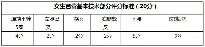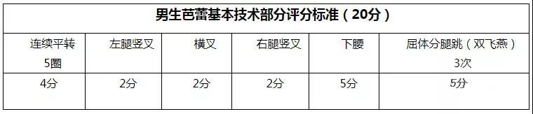 2、芭蕾基本技術組合(20分)評分內容:完成規定的芭蕾基本技術組合動作評分方法:男生:考生身著緊身芭蕾服,依次完成以下組合:連續平轉5圈接左腿豎叉接橫叉接右腿豎叉接下腰接屈體分腿跳(雙飛燕)3次,考官根據考生考試過程目測打分。